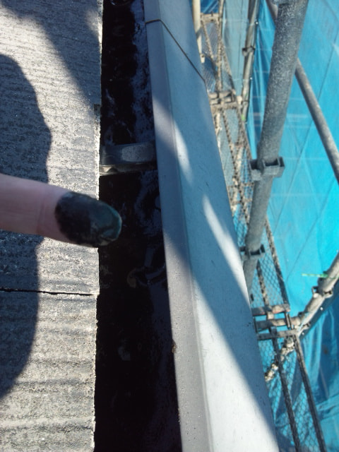 2016年3月17日 樋の中 塗装中のお家の樋の中です。こんなに土が積もっています。これは少し乾かせてスコップですくって取り出します。このまま放置しておくと、樋が重くなったり、詰まったり、またはその土に植物が生えたりします。足場があるからこそできることです。